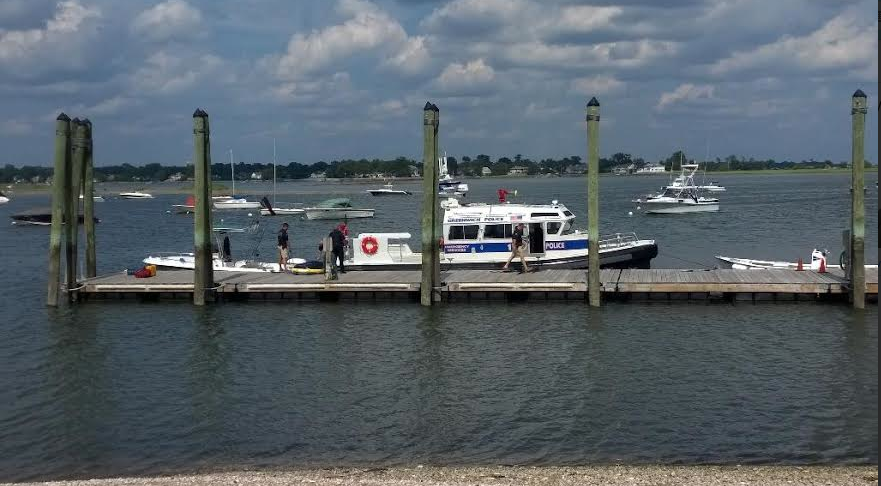 Photo: Greenwich Police Marine Unit with the boat involved in the accident at the Old Greenwich Yacht Club. Credit: Greenwich Police.