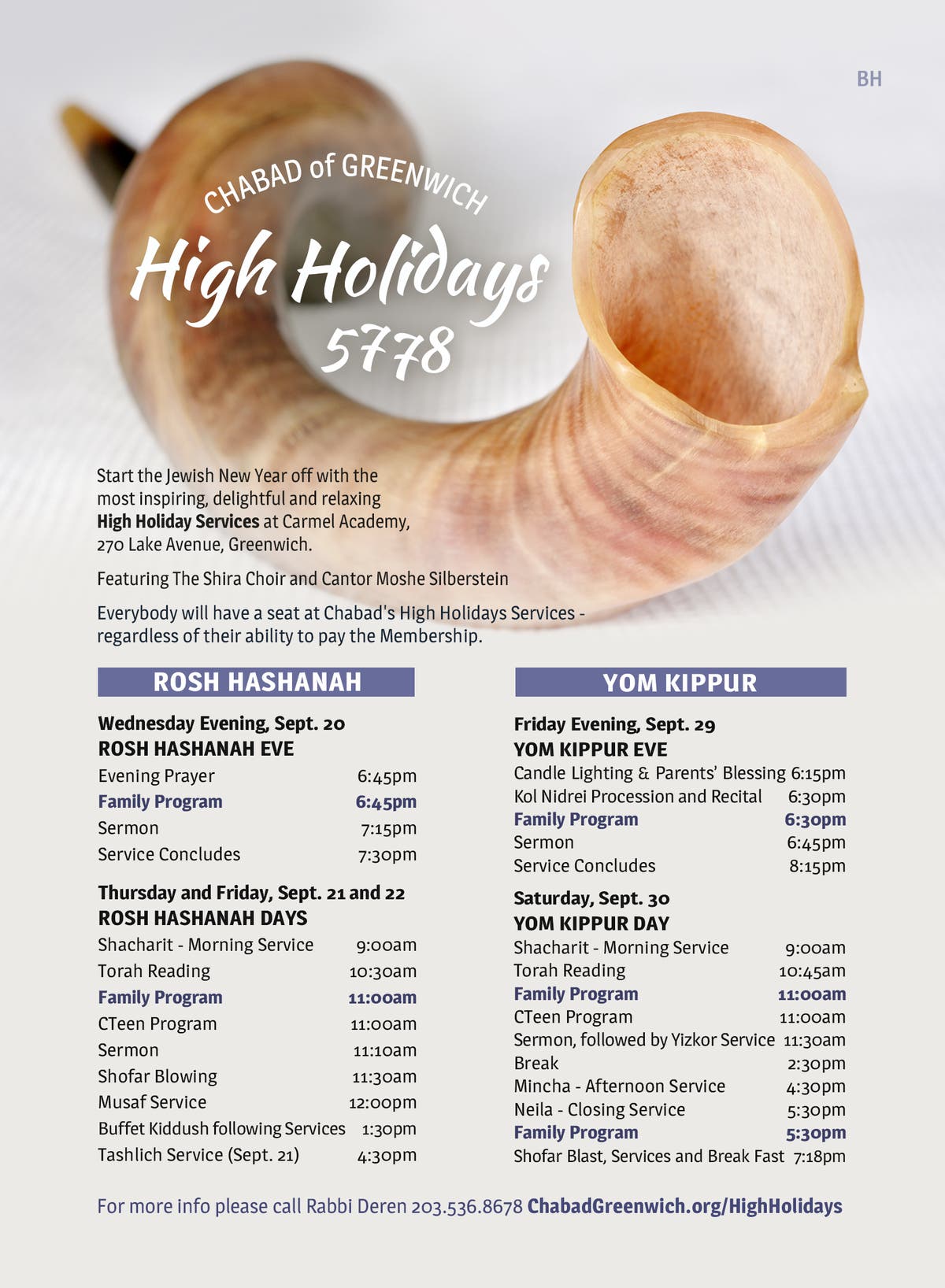 Kol Nidrei, the opening prayer of Yom Kippur—the Jewish Day of Atonement—begins with a 6:30 P.M. family service on Friday, September 29th, and services continue the next day with family services at 11 A.M. and 5:30 P.M., ending with a shofar blowing and a break-fast for all. For the full holiday schedule, visit www.chabadgreenwich.org and click on “Upcoming Events” and “High Holiday Schedule.”