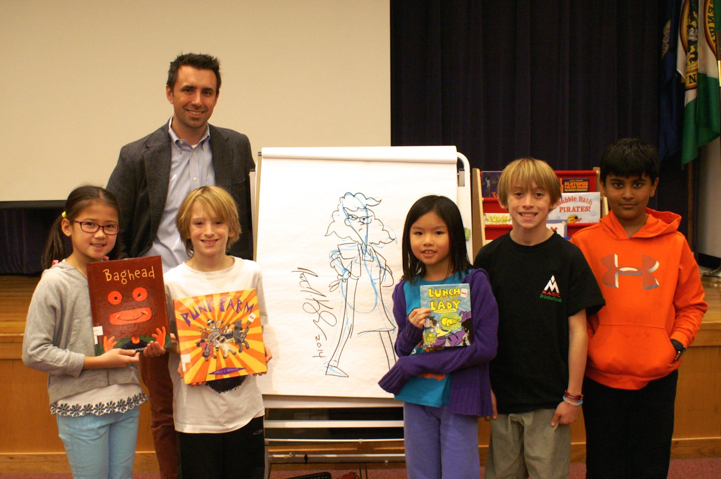 Pictured (L-R): International School at Dundee fourth grade students – Ella Carpenter, Peter Aysseh, Katie Huang, Ben Aysseh and Raghav Srinivasan – pose with author Jarrett Krosoczka, after a presentation about writing and illustrating on December 5.