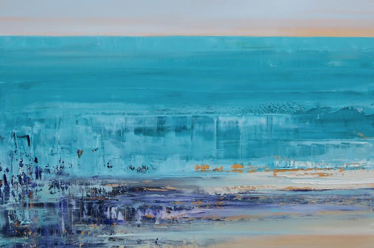 In her artist’s statement, Sussberg said, “I think of my work as painting a feeling, with just enough information to convey that feeling to a viewer. It’s up to the viewer’s imagination to fill in the details. Sometimes I sit at the beach and just look – at the way the water sparkles as it rolls over the sand, at the patterns created by the waves coming ashore, at the point where the horizon meets the sky. I take that inspiration with me back to my studio and work on translating it with paint and my knife always beginning from a point of view of color. I have a never ending fascination with the way sunshine reflects on water, how it feels and how it affects the colors of our environment and everyday life. I feel very fortunate to live in a beautiful place that is a never ending source of ideas for new paintings based on the extraordinary landscape surrounding me. Color, texture and the reflection of light are key elements of my work.