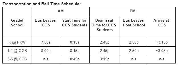 In order to ensure all current K-2 bus students arrive at CCS in time to catch the bus to the relocation host schools, the current schedules for Buses CC1 and CC2 must be adjusted by approximately 30 minutes. Three buses will be added to transport students to Parkway and Old Greenwich School from Cos Cob School as the hub stop.