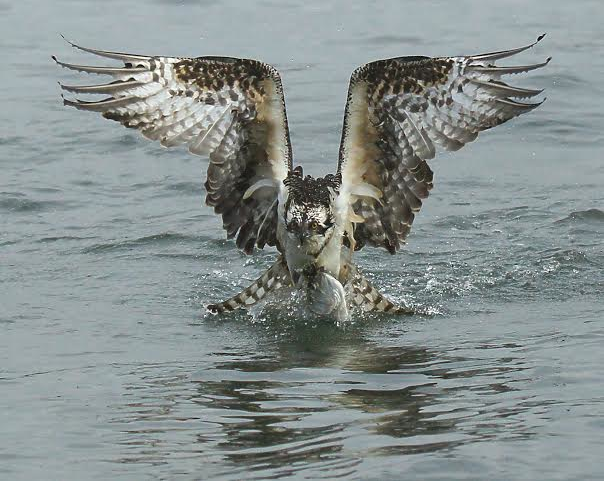 Here’s his description: “I took this photo of an Osprey (aka “Sea Hawk”) as it dove, caught a fish for lunch (the fish is a bunker) and is taking back off with it tightly grasped in its talons so it can find a tree nearby to land and gobble it down.”