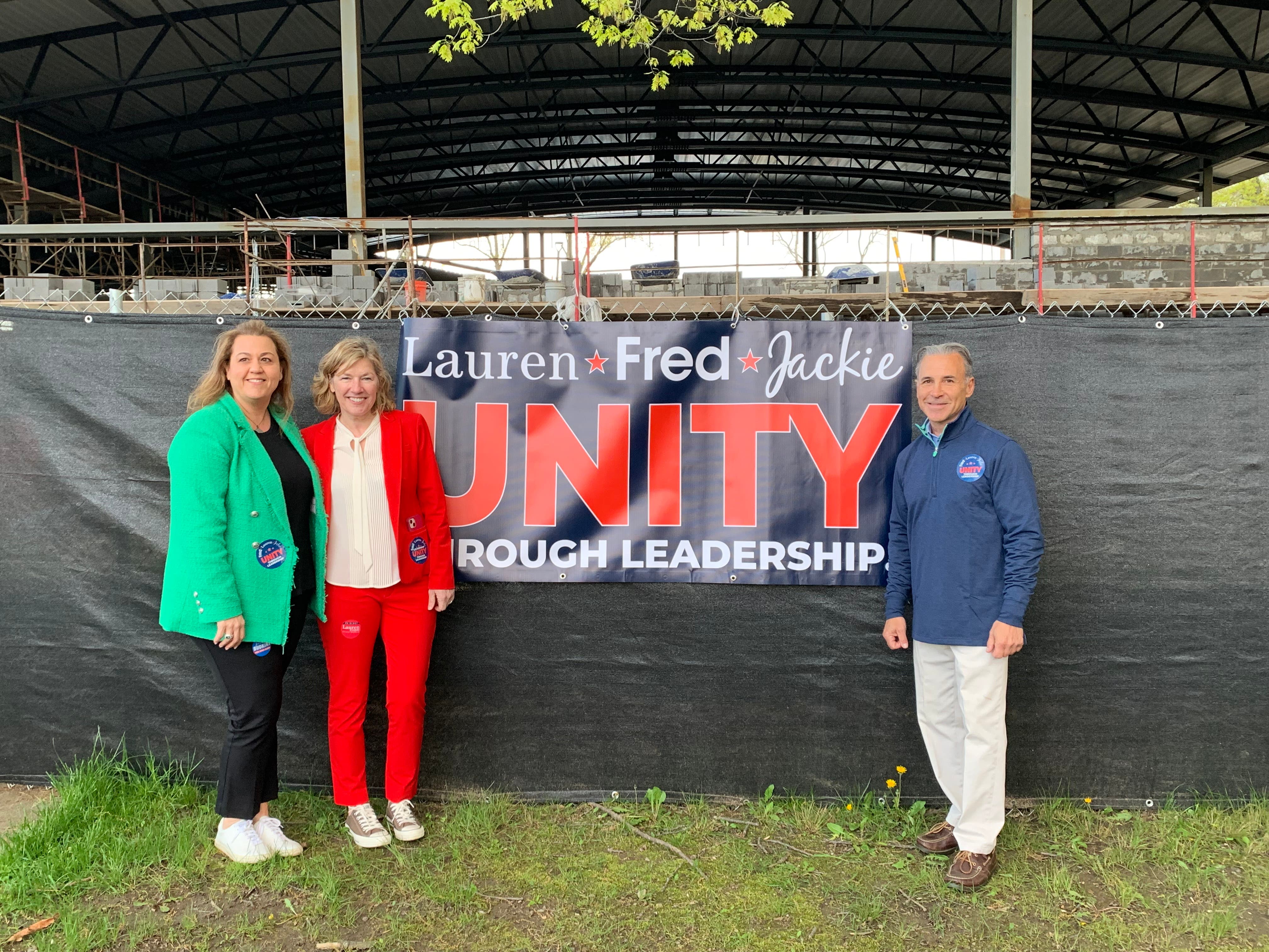 Behind the three candidates on Monday was a campaign banner, with the words "Unity Through Leadership" and the names of Camillo, Rabin and Budkins. Rabin recalled advice she received from the late David Theis, a former selectman, who told her, "If you want to win in the field, you're not going to win if you're fighting on the bench."