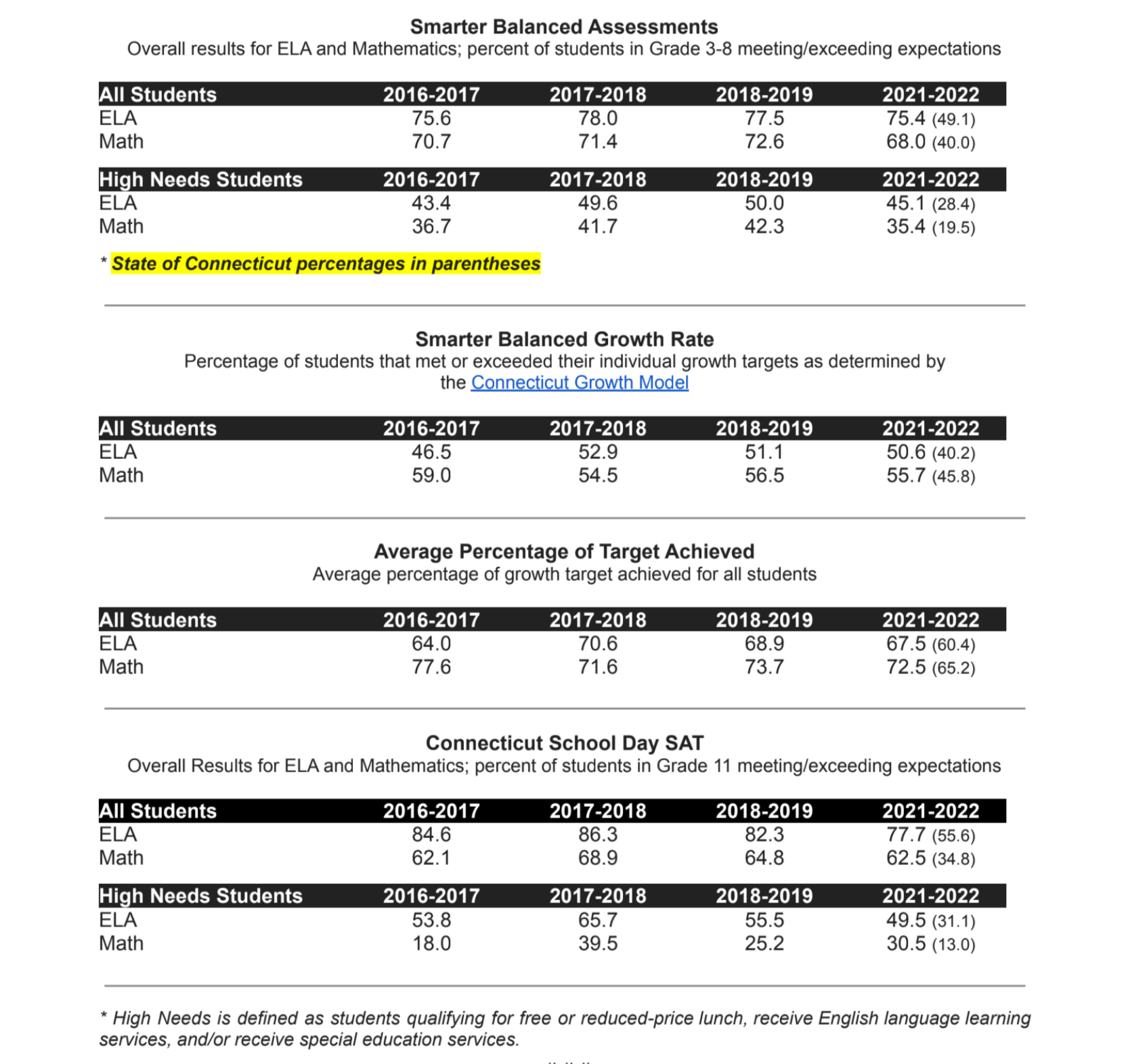 The Connecticut State Department of Education released the results of the 2021-2022 Smarter Balanced assessment, which is the accountability assessment in English Language Arts (ELA) and Mathematics for students in Grades 3-8, and Connecticut School SAT results.