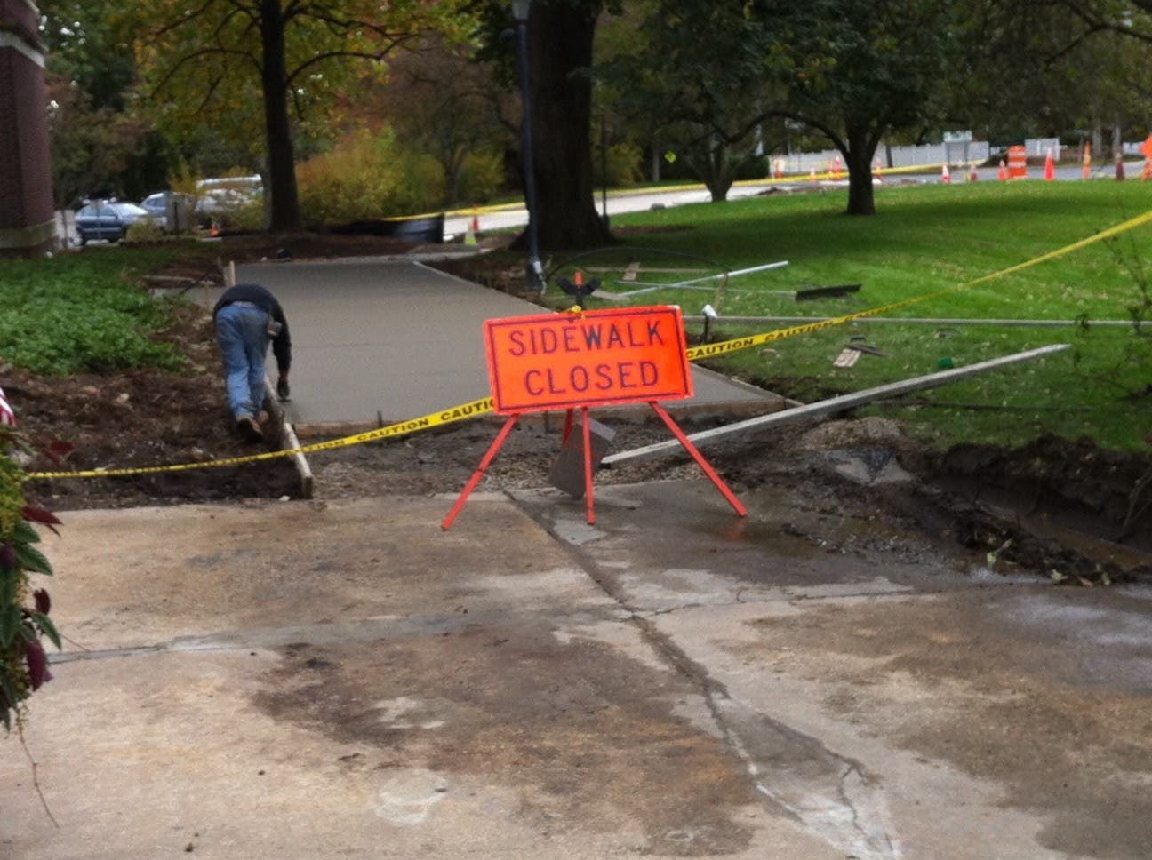 Photo: A workman puts the finishing touches on the new cement sidewalk at Greenwich Town Hall. Credit: Barbara Heins.