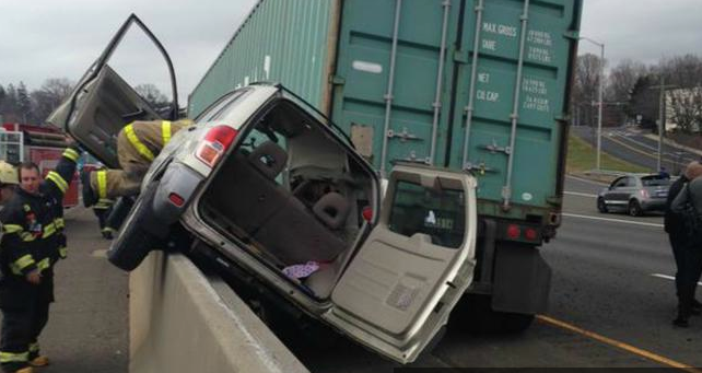 Miraculously, no one was seriously injured when the cargo trailer being hauled on southbound I-95 disconnected from the truck tractor pulling it and slammed into a passenger car, forcing the car onto the Jersey barrier in the center of the highway in Cos Cob Monday morning.