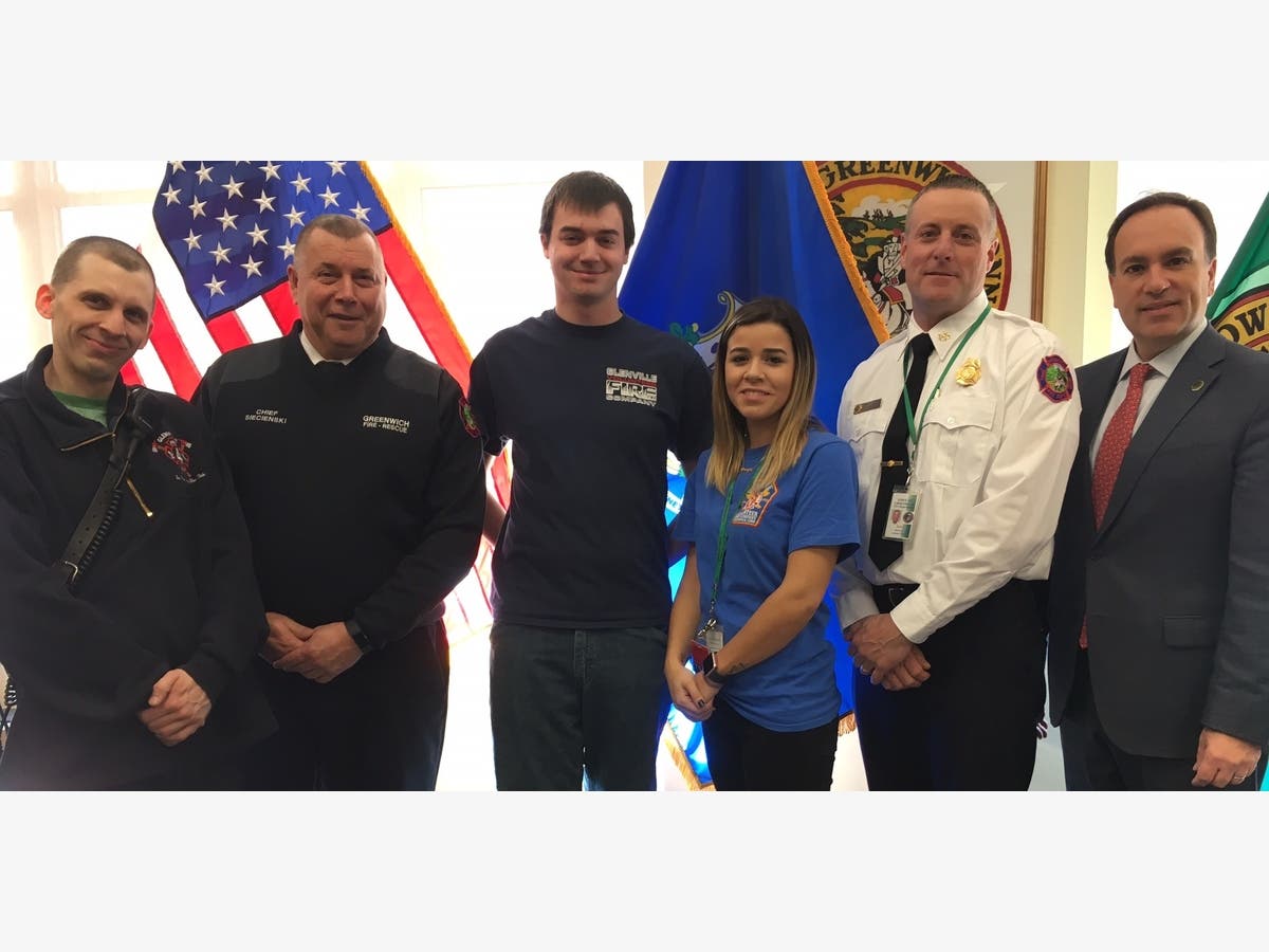 Photo: From left, Glenville Volunteer Fire Company Fire Police Captain Mark Horvath, Greenwich Fire Chief Peter Siecienski, Glenville Fire Police Officers Patrick Rooney and Jennifer Almeida, Assistant Greenwich Fire Chief Robert Kick and Greenwich First Selectman Peter J. Tesei. Photo credit: Town of Greenwich