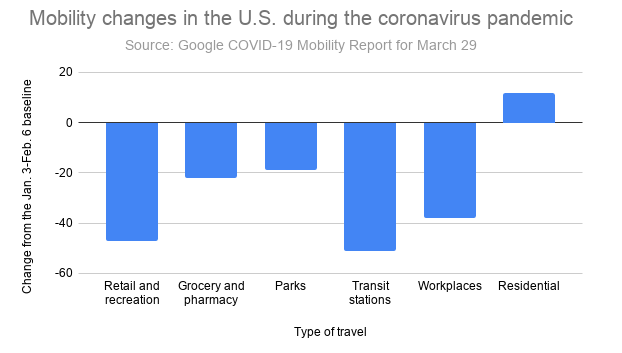 As of March 29, Google reports that nationwide movement to retail and recreational locations, including restaurants, shopping centers, movie theaters and the like, dropped 47 percent against a baseline set for the weeks Jan. 3 to Feb. 6.