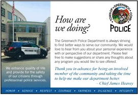 And that’s the question Police Chief Jim Heavey is asking the Greenwich community. The department is conducting an informal “How are we doing?” survey. Residents can voice their comments online or via comment cards that can be picked up at Police Headquarters and Town Hall. There are plans to place the cards at the town library branches, according to Heavey.