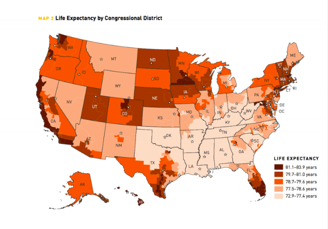 The longest life expectancy in the U.S. is in California’s 19th Congressional district, which includes San Jose and part of Santa Clara County, where people live 83.9 years on average, or roughly as long as people in Japan.