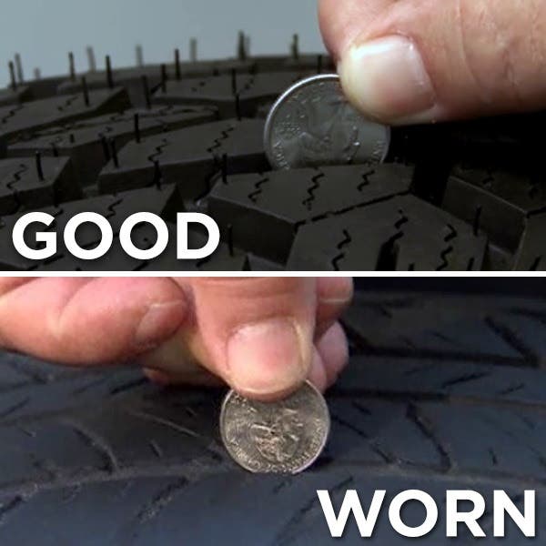 In Connecticut, drivers aren’t allowed to drive on tires with tread depths below 2/32nd of an inch. To easily determine that measurement, slip an upside-down quarter between your tire grooves, and look at Washington’s head. If you can see all of it, it’s time to shop for new tires.