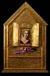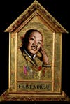 The artist, Pamela Chatterton-Purdy says, “The series emerged out of my own concerns during the Civil Rights era when my husband, David, and I were first married and living in Chicago in the early 1960’s.” She used the icon format for her paintings to suggest the sacred nature of the movement. Traditionally, icons are religious paintings on wood panels depicting scenes from the Bible and often set in golden background. Chatterton-Purdy uses gold leaf, handmade paper, oil painted collage paper and found objects that best symbolize the person or event represented. The Icons exhibit has been shown throughout the United States in more than 40 colleges, universities and galleries.