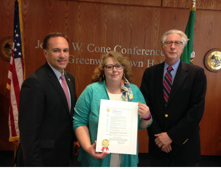 Contributed photo: Greenwich First Selectman Peter Tesei, left, presents a proclamation declaring May as Mental Health Awareness month for the Town of Greenwich to Patsy Schumacher, Case Manager and Alan D. Barry, Ph.D., Commissioner for the Greenwich Department of Social Services.