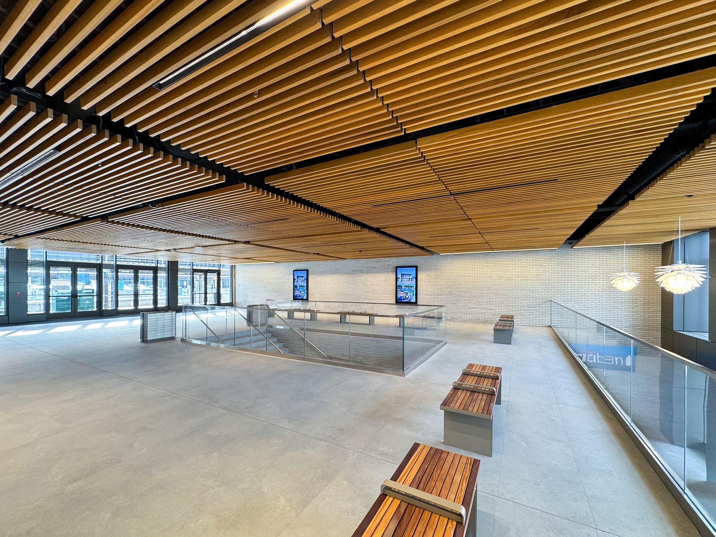 Interior improvements include full-glass entrance facades, a wood-slatted ceiling, new lighting, renovated restrooms, updated flooring, glass railings, signage and a new elevator.
