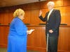 Photo 1: GreenwichTown Clerk Carmella Budkins administers the oath of office to Republican John F. Toner, the new Selectman. Credit: Barbara Heins.