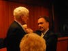 Photo 3: First Selectman Peter Tesei places a Greenwich town flag lapel pin on new Selectman John Toner. Credit: Barbara Heins.