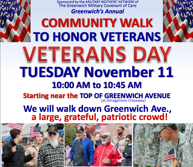 10 a.m. Sponsored by the Military Mothers’ Network of The Greenwich Military Covenant of Care there will be the 2nd annual community walk beginning at the top of Greenwich Avenue walking down the Avenue to the World War I memorial at the corner of Arch Street and Greenwich Avenue.