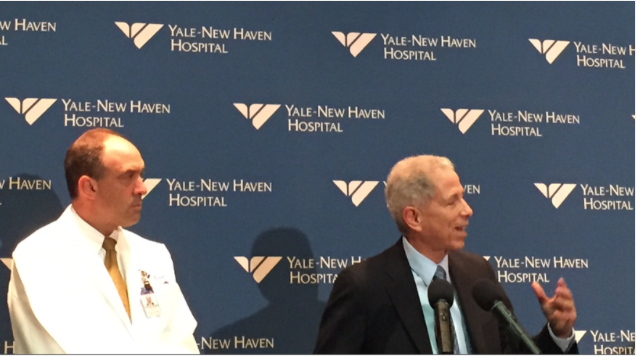 Picture: From left: Dr. Thomas Balcezak, the hospital’s chief medical officer, and Robert J. Alpern, dean of the Yale School of Medicine, at a news conference Thursday. (Photo by Rich Scinto)