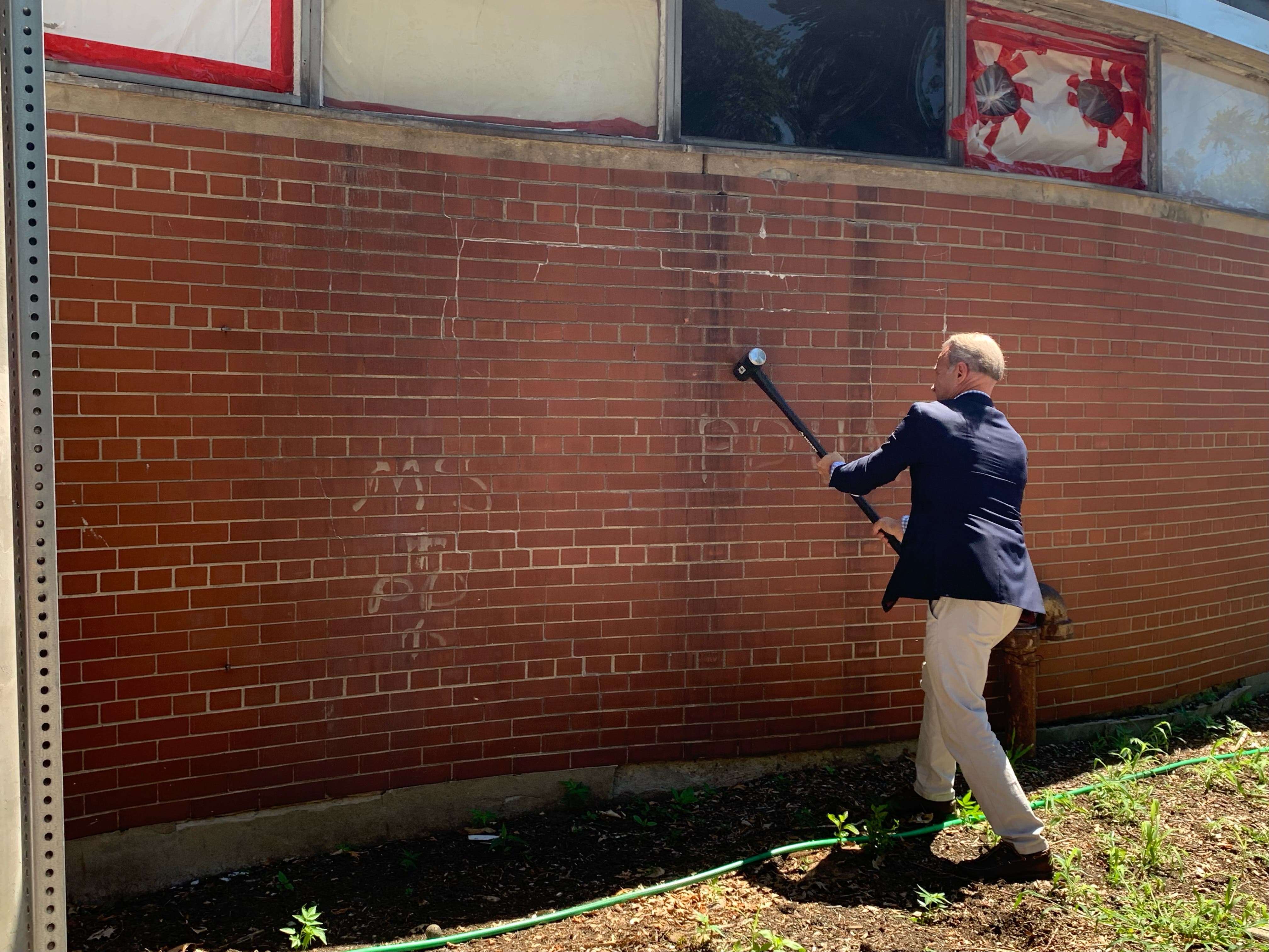 First Selectman Fred Camillo, state Rep. Steve Meskers (D-150), Parks and Recreation Director Joe Siciliano, Parks and Rec. Board member Scott Johnson, and Susie Baker of the Greenwich Point Conservancy all stood at the entrance of the boarded up building and reminisced about old times at the civic center. They even took turns wielding a sledgehammer against the brick exterior.