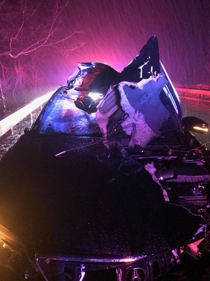 GREENWICH, CT — Strong winds knocked a tree onto a passing vehicle Tuesday morning on the Merritt Parkway northbound between exits 31 and 33.