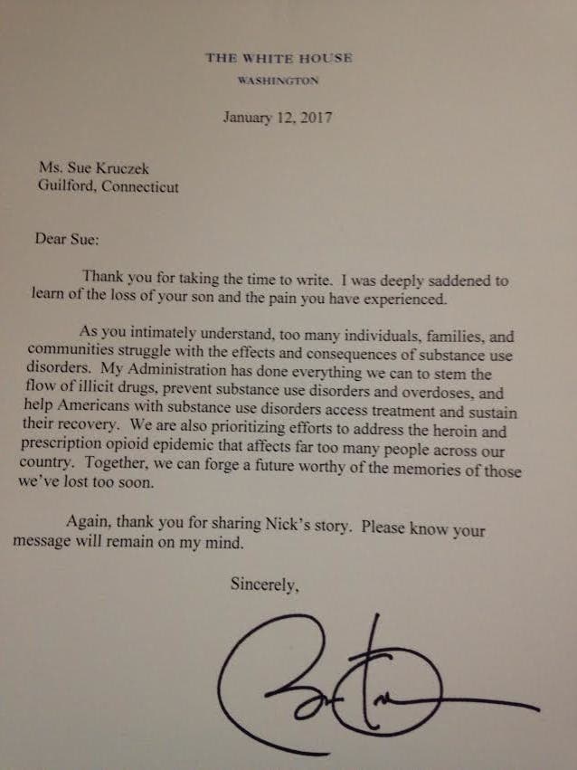 Guilford Woman Whose Son Died of a Drug Overdose Receives Letter From Barack Obama