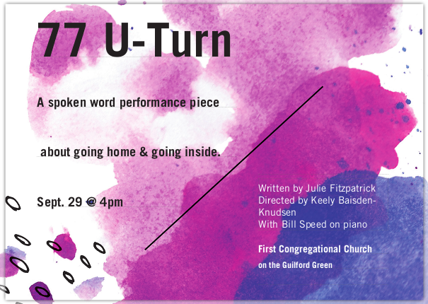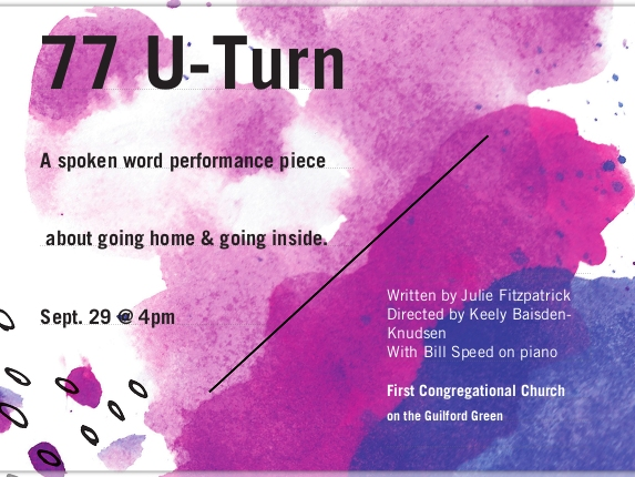 77 U-Turn is a piece about revisiting one’s childhood home and a beloved brother’s fall into the grasp of mental illness. Poetic, touching, and honest, 77 U-Turn is about coming home, parenting, love, loss, confusion and what happens when we turn around and look back before moving forward. Written and performed by Julie Fitzpatrick, accompanied by Bill Speed on piano, and directed by Legacy Theatre Artistic Director Keely Baisden Knudsen.