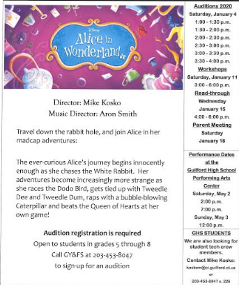 GUILFORD, CT — Guilford Youth & Family Services Family Theater announced auditions for its spring 2020 production of Alice in Wonderland Jr.