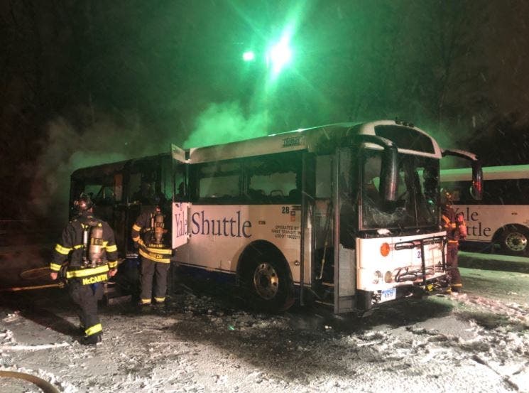 HAMDEN, CT — Hamden firefighters battled a surprise snowstorm to extinguish a bus fire early Tuesday morning. Crews responded to a Yale Shuttle bus engulfed in flames in the lot at 1351 Dixwell Avenue at about 6:20 a.m.