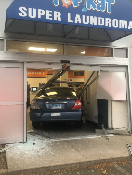 Emergency crews were operating at the scene of Top Kat Laundromat, 852 Dixwell Avenue, around 5 p.m. Officials said one customer and the driver were taken to the hospital with minor injuries.