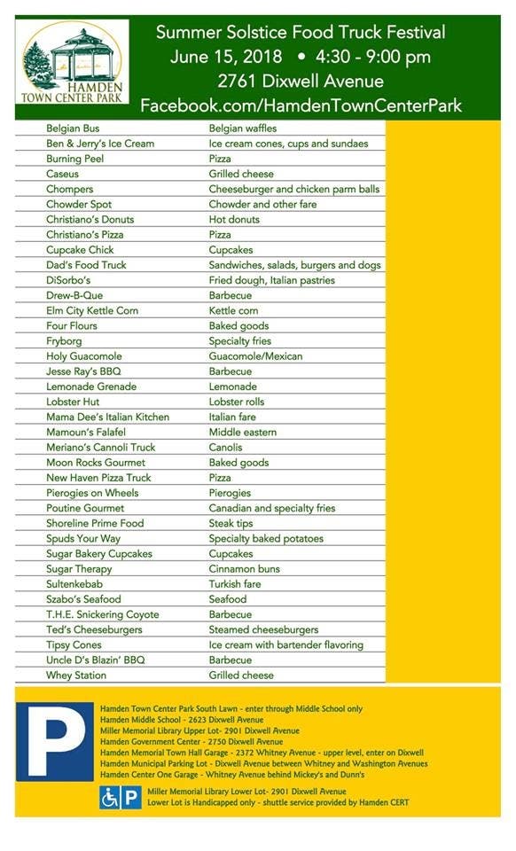 HAMDEN, CT — The 2018 Summer Solstice Food Truck Festival will take place Friday, June 15 at Hamden Town Center Park, 2761 Dixwell Avenue in Hamden, beginning at 4:30 p.m. This year’s event features 37 food trucks, kids’ activities and a live performance by local band Wango Tango. DJ Rachel Entertainment will perform between sets on the main stage and Bryan Poole will be leading the kids dance party on the barn stage.