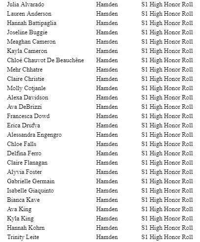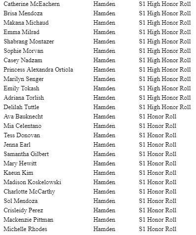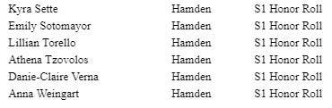 HAMDEN, CT — Sacred Heart Academy Principal Sr. Kathleen Mary Coonan, ASCJ, recently announced the Honor Roll for the first semester of the 2018 – 2019 academic year. The following students from Hamden were named to the Honor Roll: