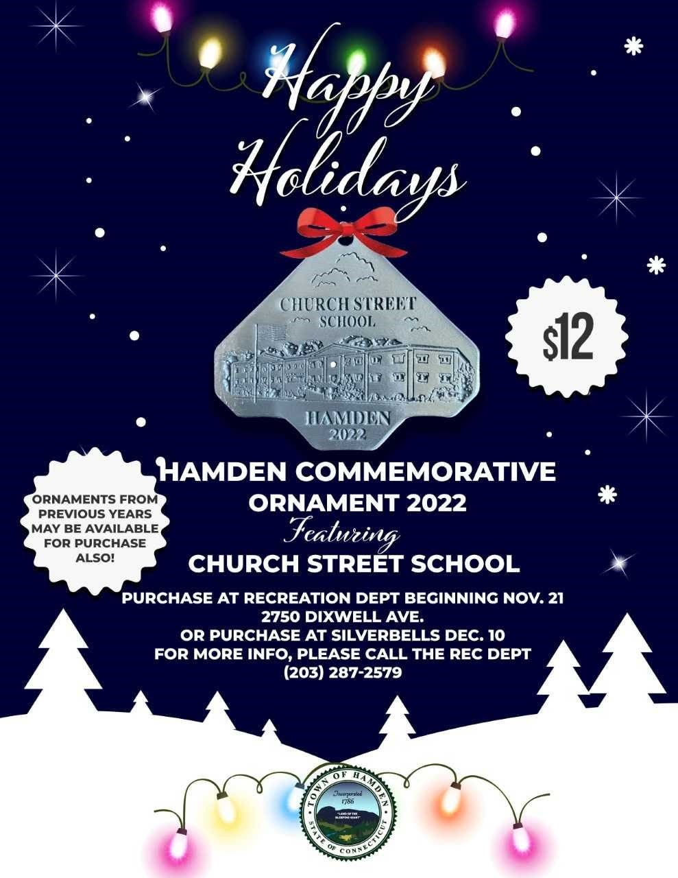 All ornaments are currently available for purchase and are sold on a first-come, first-served basis. Ornaments can be purchased at Hamden’s Recreation Department, 2750 Dixwell Ave., during their regularly scheduled hours, and also at Hamden’s Silverbells Festival on Saturday, Dec. 10 at Town Center Park.