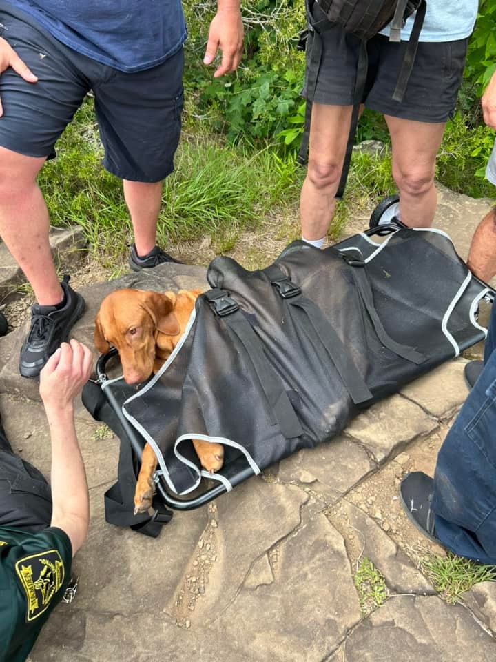 HAMDEN, CT — A group of officials and civilians banded together Wednesday to carry a dog injured at Sleeping Giant State Park to safety on a stretcher.