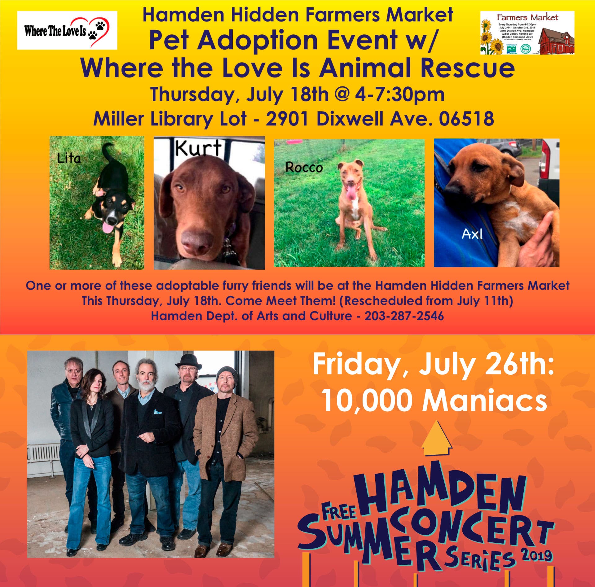 Come out for a pet adoption event at the Hamden Hidden Farmers Market and the third Hamden Free Summer Concert this Thursday and Friday!