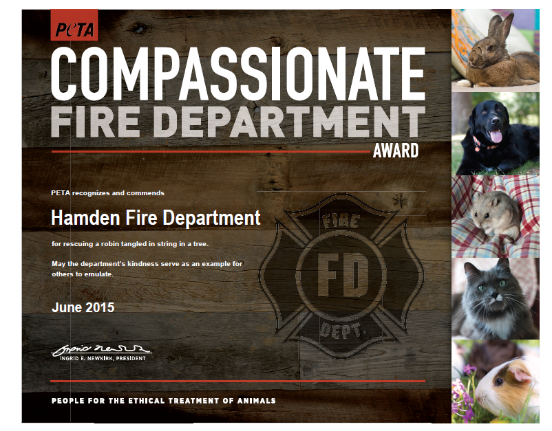 A Compassionate Fire Department Award is on its way from PETA to the Hamden Fire Department for its clever rescue of a robin who was found hanging upside down from a tree branch, tangled in a balloon string.