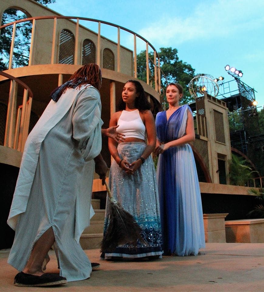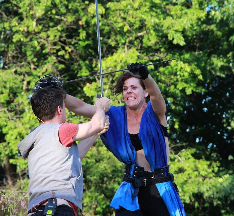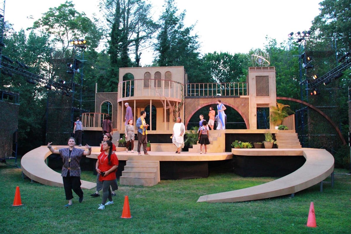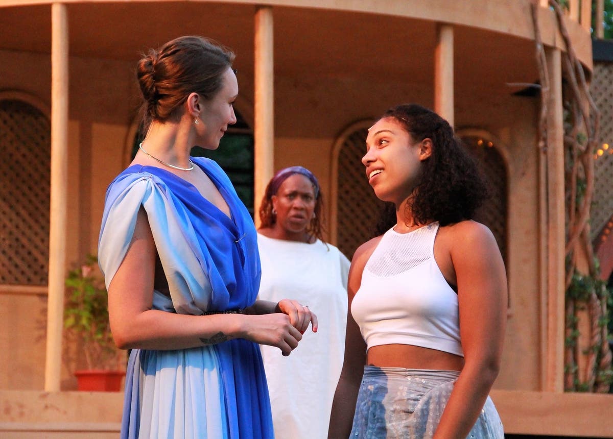 The fight director Ted Hewlett provided some excitement and set designer Elizabeth Bolster in her 14th season with Elm Shakespeare dreamed up a complex and very beautiful two-level set that fit well in the outdoor space. Jamie Burnett lit everything perfectly and the sound design by Michael Vincent Skinner, despite a few glitches this year, still managed to outpace most outdoor sound venues.