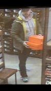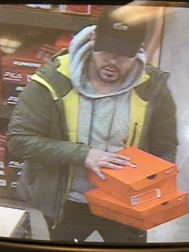 Smith said investigation revealed that an individual, described as a white male, wearing a black hat and a gray-hooded sweatshirt, exited the store, while wearing a stolen pair of sneakers.