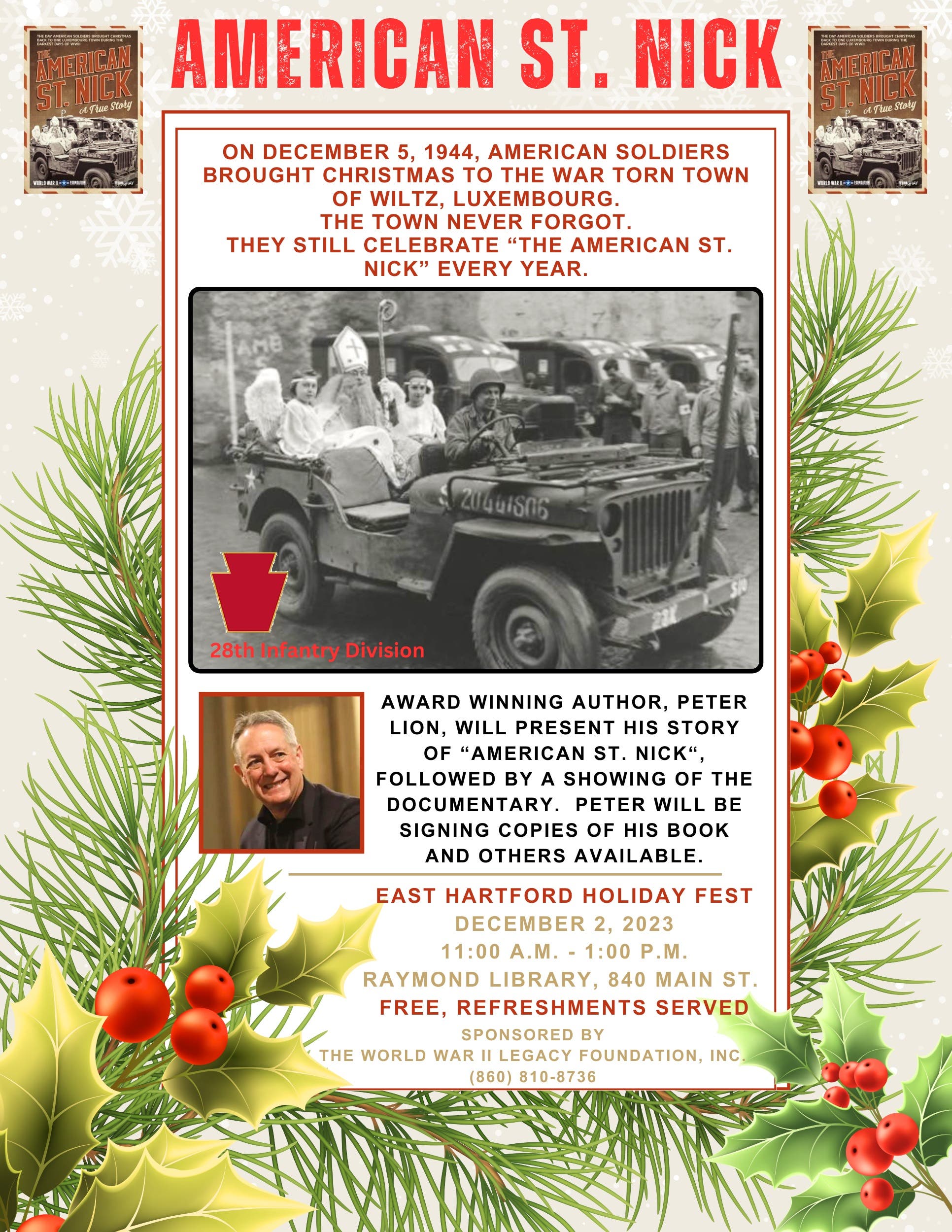 World War II exacted a heavy toll on the people of Wiltz, Luxembourg, nearly destroying the small town which was occupied by German forces for four years. The documentary THE AMERICAN SAINT NICK chronicles a day at the height of the war when the battle-weary 28th Infantry Division of the American Army returned hope and joy to the children and people of this war-torn town. On Dec. 5, 1944, American soldiers, led by Harry Stuts, put their guns down for one day and organized a party celebrating the town's centuries-old Saint Nick tradition. An emotional and heartfelt story, THE AMERICAN SAINT NICK illustrates how American soldiers and residents of the hamlet were able to bond over a moment in time, creating a tradition that continues to this day. Event is part of Holiday Fest 2023.