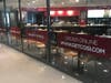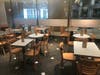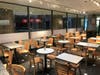 A glass window wall surrounds the dining area. Inside are grey walls with dark marble along the kitchen, grey tile floors, and red and black accents throughout. With track and recessed lighting, the space also features tan wooden chairs with seating for 44. Wall art depicts Così’s original Paris locale, which opened in 1989.