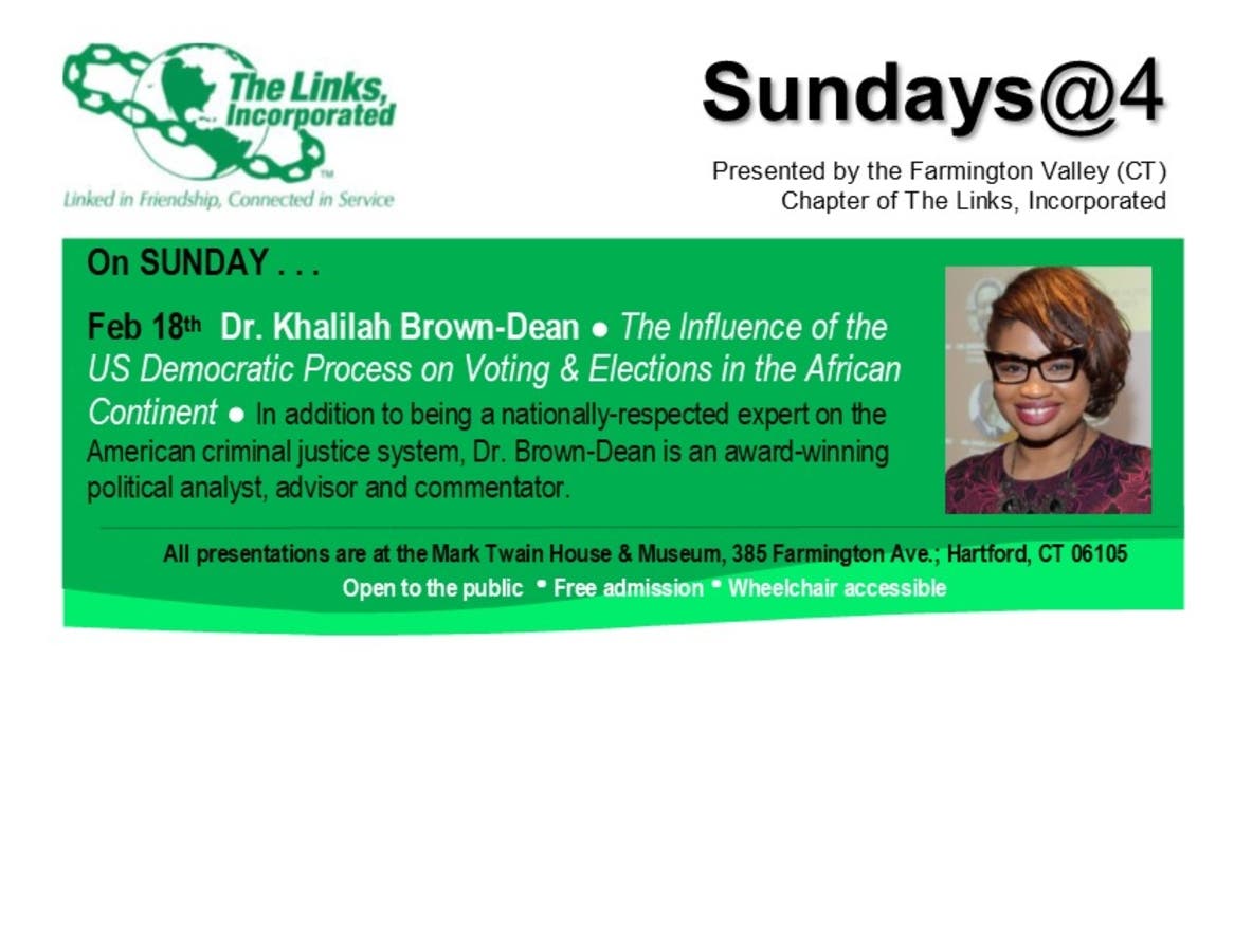 On February 18th, Sundays@4 will feature Quinnipiac professor, Dr. Khalilah Brown-Dean who will talk on the influence of the US Democratic process on voting and elections in the African continent. Dr. Brown-Dean is also an award-winning political analyst, advisor, and commentator for numerous agencies and organizations including The New York Times, NPR, CNN, The Wall Street Journal, etc.