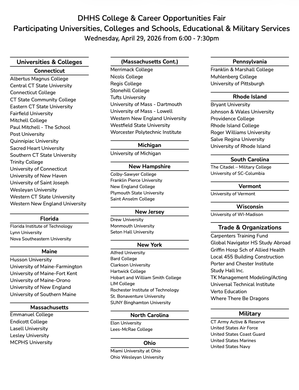 MADISON, CT — A College & Career Opportunities Fair is scheduled for April 29 at Daniel Hand High School in Madison, according to district officials.