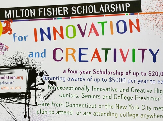 The Milton Fisher Scholarship for Innovation and Creativity was established in 2003 at The Community Foundation for Greater New Haven by the Reneé B. Fisher Foundation. This scholarship is not a traditional scholarship focused on rewarding academic achievement and addressing financial need. Its specific goal is to reward and encourage innovative and creative problem-solving. High school juniors and seniors and college freshmen from Connecticut and the New York metropolitan area are eligible to apply. The application deadline for 2016 is April 30th. Potential applicants should consult the listings of past winners at www.rbffoundation.org and may apply online at www.cfgnh.org/scholarships.