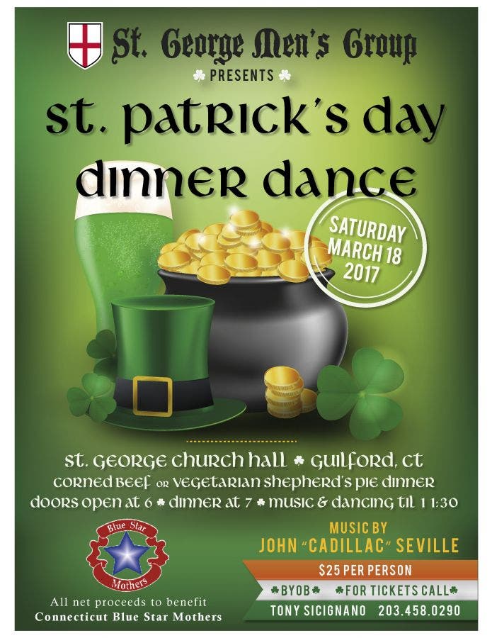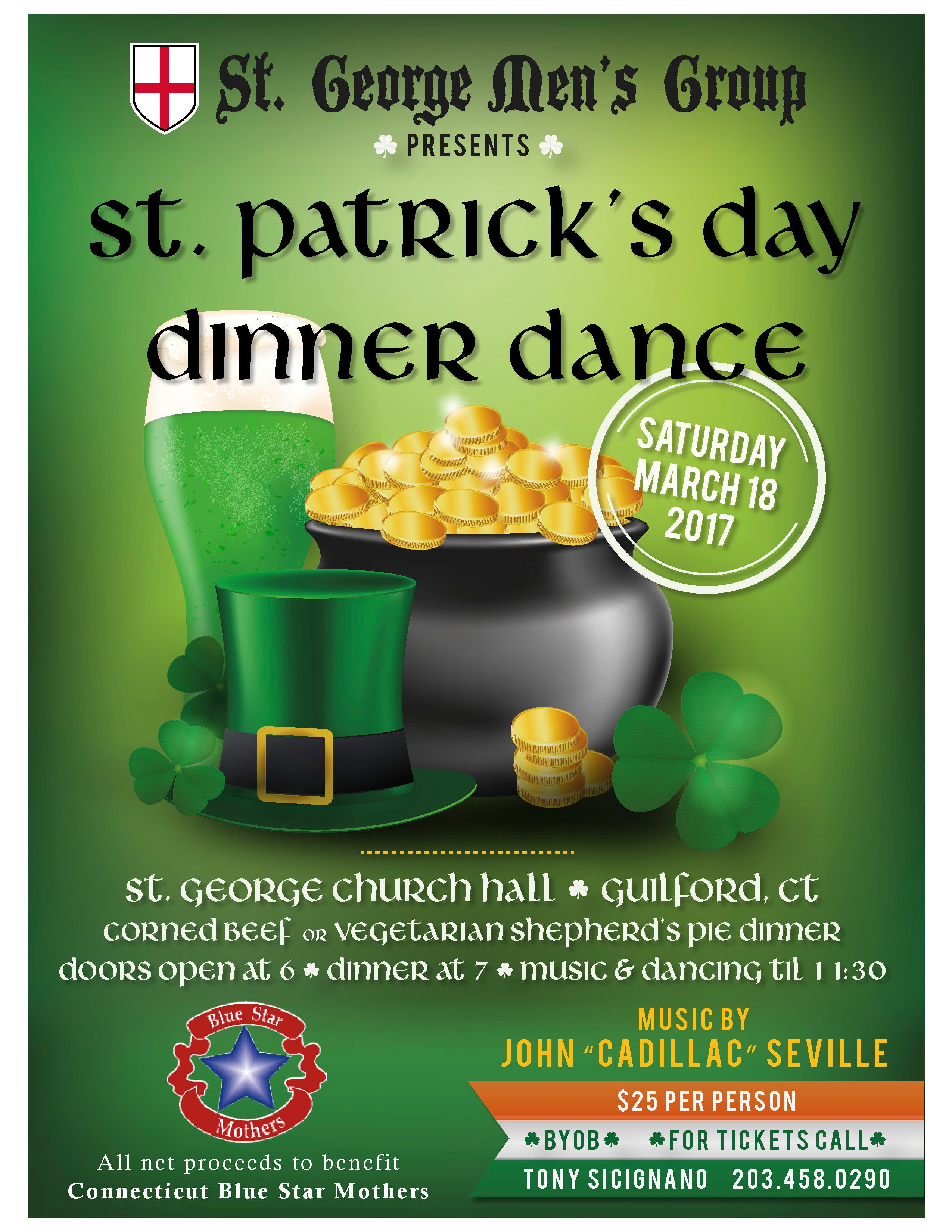 From St. George Men's Group: Come one come all…come join the St. George Men’s Group in celebrating St. Patrick’s Day and helping the Connecticut Blue Star Mothers. On Saturday March 18, 2017 we will be hosting a Dinner/Dance. Come dance the night away with John “Cadillac” Seville after a great dinner of either Corned Beef or Vegetarian Shepherd’s Pie.