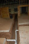 The current plan is to have the main entrance be on the south side of the building with a main hallway through the center. The renovated space will likely include additional training and simulation areas, a relocated locker area, new offices, a medical supply staging area, and two new restrooms. The plans remain fluid. Trenches for septic drainage and rough-outs for the new bathrooms can be seen here.