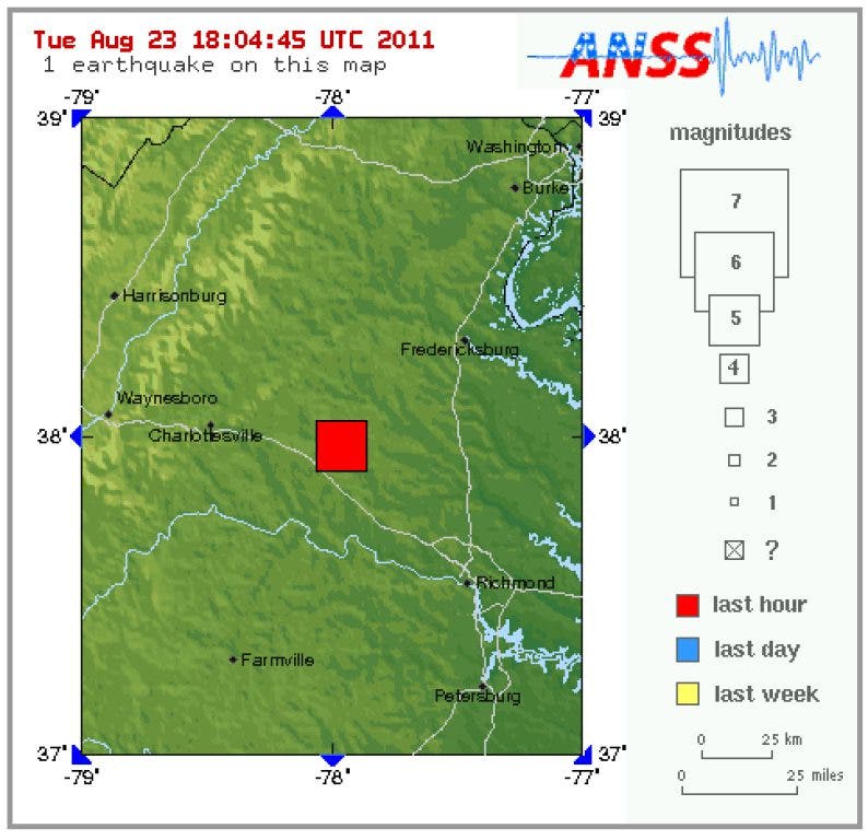 The earthquake struck at approximately 1:53 p.m. north of Richmond, VA.