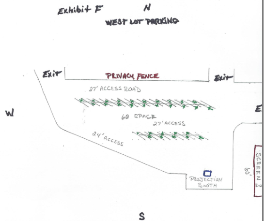 A hand-drawn map supplied by the Manchester Planning Department shows an angled layout for the outdoor theater with a "privacy fence" with 60 spaces. The access roads are on the north side of the property, according to the hand-drawn layout. The projection booth and screen would be located on the south end, according to the map.