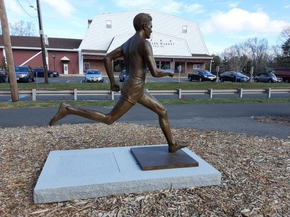 Michael Keropian, a New York sculptor, created the life-sized bronze statue of the Olympic medalist for Manchester's Sculpture Project. Learn more about the sculpture project here.
