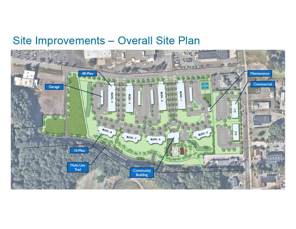 Public improvements featured in the plans include the extension of the Bigelow Brook Greenway, an original component of the town's "redevelopment vision." The greenway will extend through the site, improving access to Center Springs Park, Downtown, and the Cheney Historic