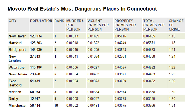 Movoto came up with this list of the most dangerous municipalities in Connecticut: