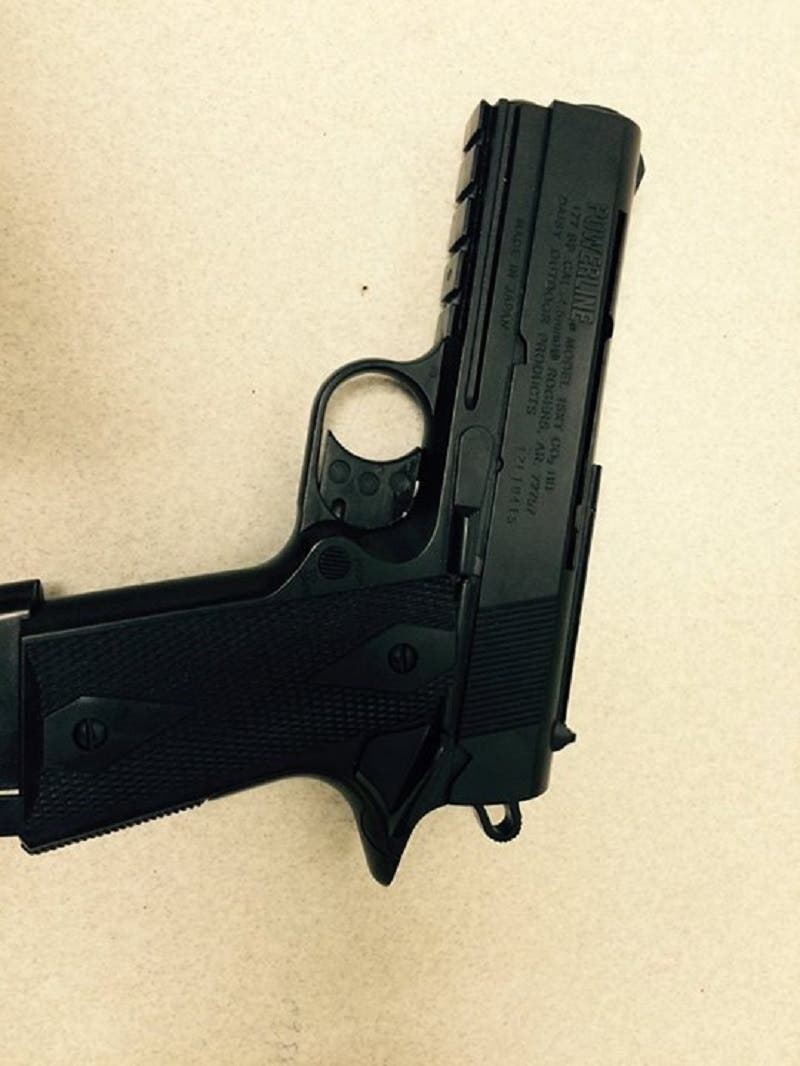 After an investigation, officers seized a black BB pistol (pictured) and a crack pipe from inside the vehicle.